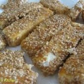 Κόβουμε τη φέτα σε 8 κομμάτια. Απλώνουμε τα φύλλα στον πάγκο και κόβουμε τη μακρύτερη πλευρά σε τρεις λωρίδες. Παίρνουμε από 2 λωρίδες κάθε φορά. Λιώνουμε το βούτυρο και με ένα πινέλο αλείφουμε κάθε φύλλο ξεχωριστά. Τοποθετούμε κάθε κομμάτι τυριού στη μία άκρη. Διπλώνουμε τα φύλλα δεξιά και αριστερά της φέτας και τα τυλίγουμε. Κολλάμε την άκρη των φύλλων βρέχοντας τα δάχτυλά μας με λίγο νερό. Τα τηγανίζουμε σε μέτρια φωτιά ώσπου να ροδίσουν. Τα αφήνουμε να στραγγίξουν σε απορροφητικό χαρτί. Σερβίρουμε περιχύνοντας με ένα κουταλάκι μέλι κάθε κομμάτι και πασπαλίζουμε με σουσάμι.