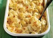 Βράζουμε το κουνουπίδι σε αλατισμένο νερό για 5 λεπτά. Στραγγίζουμε και το βάζουμε σε ένα πυρίμαχο σκεύος. Βάζουμε στην κατσαρόλα το βούτυρο και το αλεύρι και τα αφήνουμε να ζεσταθούν ανακατεύοντας κατά διαστήματα. Ρίχνουμε το γάλα, τη σκόνη μουστάρδας, αλάτι και πιπέρι. Βράζουμε σε χαμηλή φωτιά, ανακατεύοντας μέχρι να γίνει παχύρρευστη μπεσαμέλ. Ρίχνουμε τα τυριά, ανακατεύουμε και περιχύνουμε με τη σάλτσα αυτή, το βρασμένο κουνουπίδι. Ψήνουμε το κουνουπίδι σε προθερμασμένο φούρνο στους 200ο για 12-15 λεπτά.